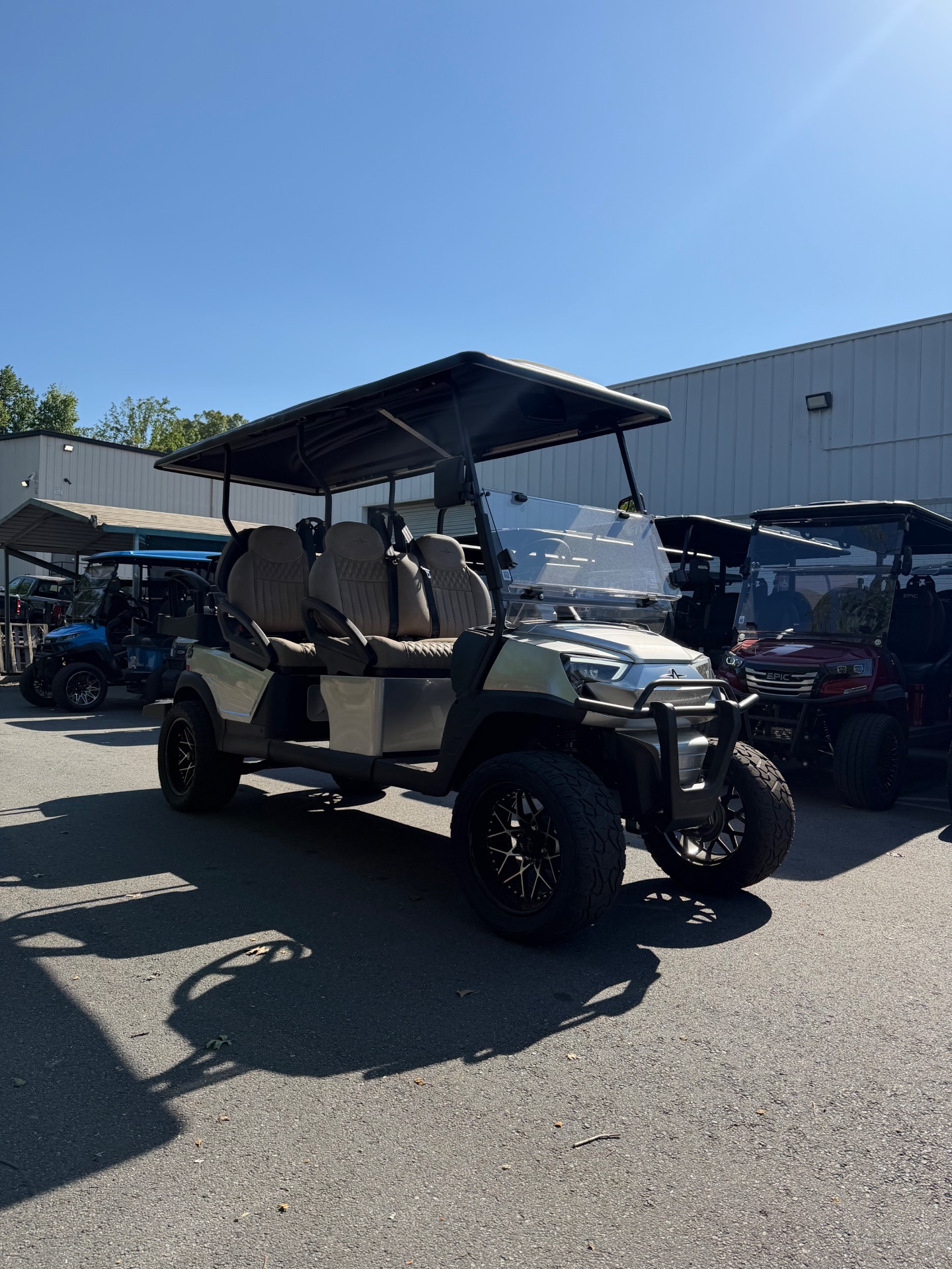 A lifted 6-passenger electric LSV with aluminum construction, premium safety equipment, and a well-appointed cabin for everyday cruising.