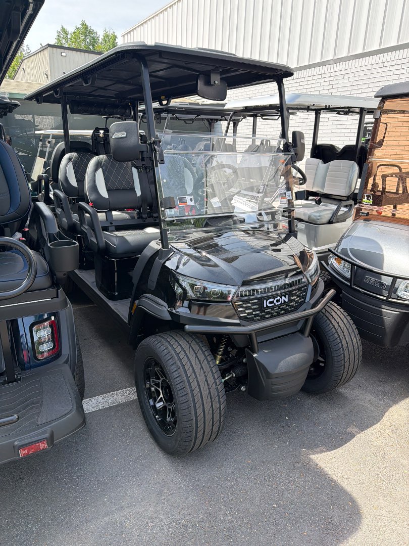 The 2026 Icon EV i60LX features a 48V ICON 5kW 3 Phase High Torque Motor, a 51V/105Ah ECO Lithium Battery, and a 450A ICON Controller. It also includes four wheel disc brakes and a 14:1 High Speed Rear Axle.